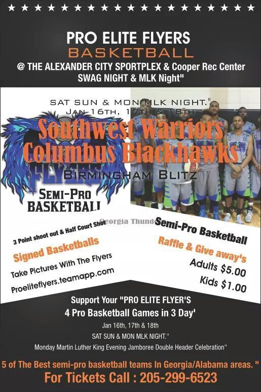 "Come out & Support your Pro Elite Flyers in Alexander city for a 2 game weekend & A Monday Martin Luther King Evening Jamboree Double Header Celebration with 4 of The Best semi-pro basketball teams In Georgia/Alabama areas. "